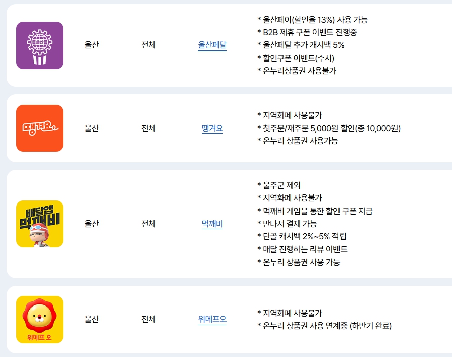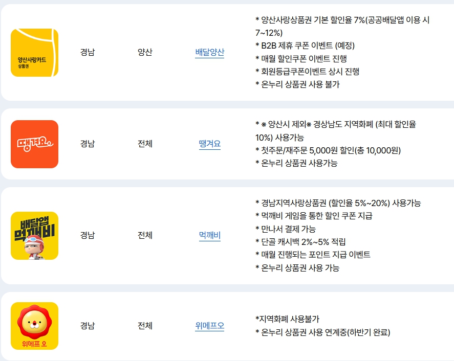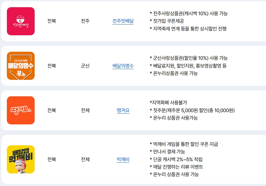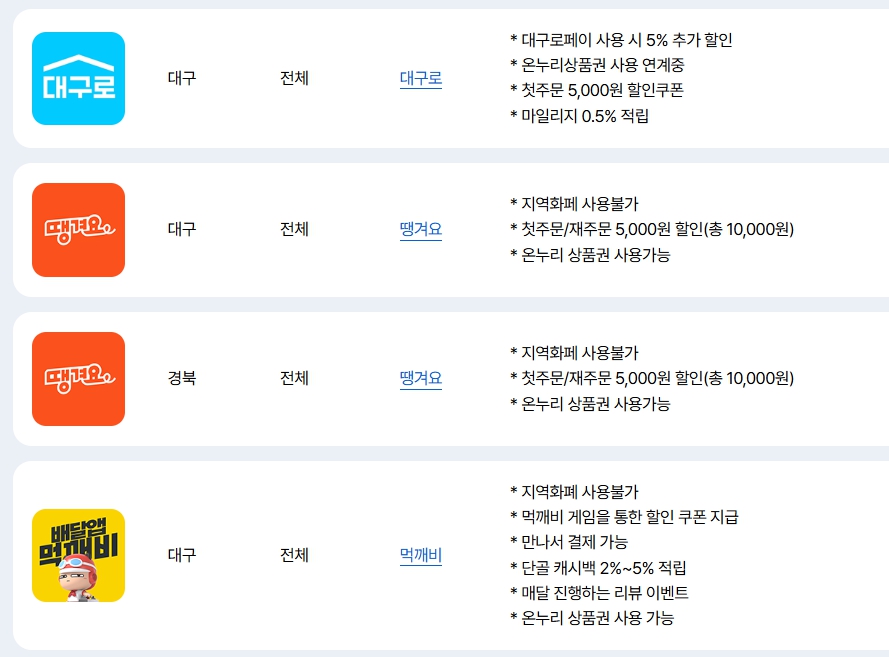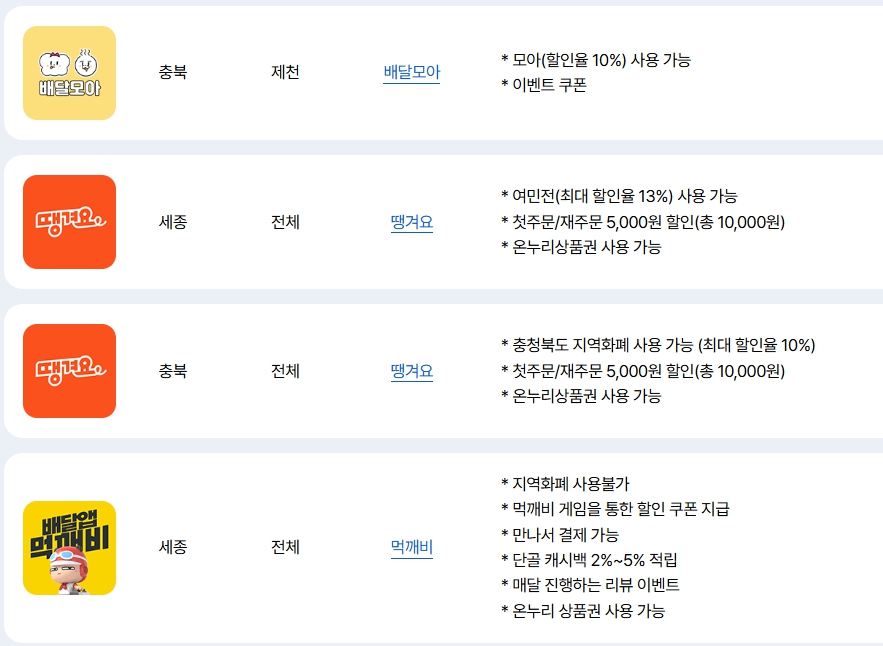 | 먹깨비 | 협약 지자체만 사용 가능 | 리뷰 이벤트, 게임 쿠폰 등 다양한 이벤트 |