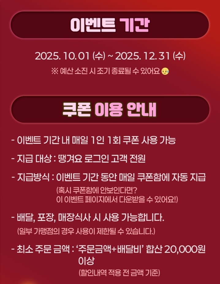 2025년 10월 1일부터 전국적으로 시행되는 ‘공공배달앱 소비쿠폰 사업’을 통해, 하루 1회 최대 5천 원까지 할인받을 수 있는 기회가 열렸습니다!