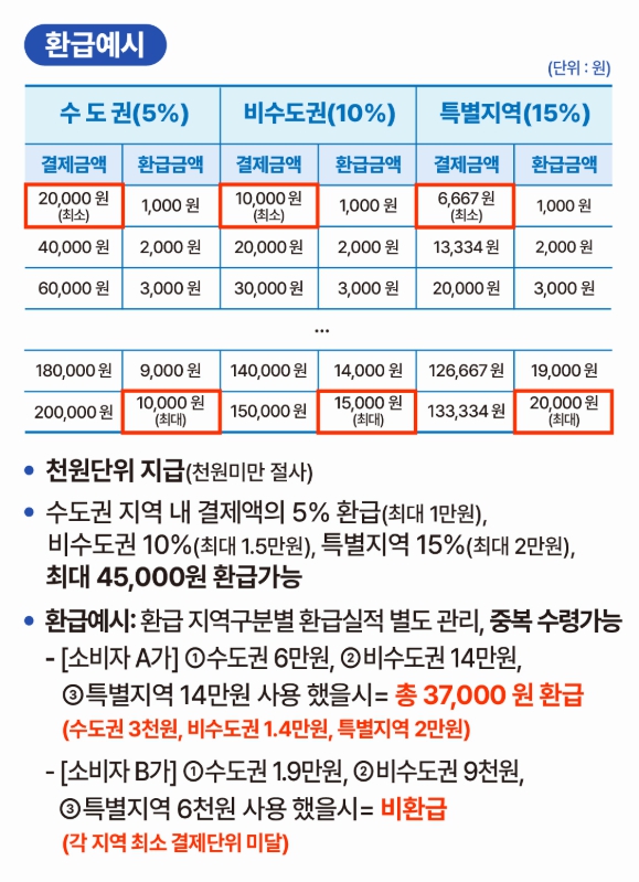 - 수도권: 20만 원 사용 → 1만 원 환급