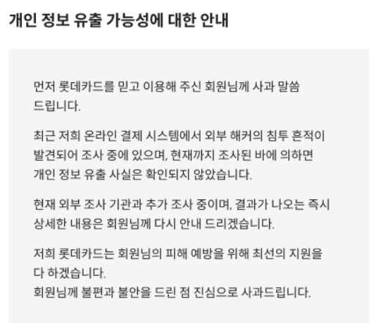 💬 중요: 개인정보 유출 범위는 아직 확정되지 않았지만, 결제 관련 정보가 포함된 것으로 추정되며 선제적 조치가 매우 중요합니다.