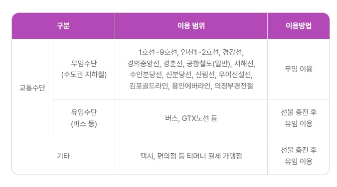 A. 지하철 무임은 수도권에 한하며, 버스는 전국 티머니 가맹점에서 이용 가능합니다.