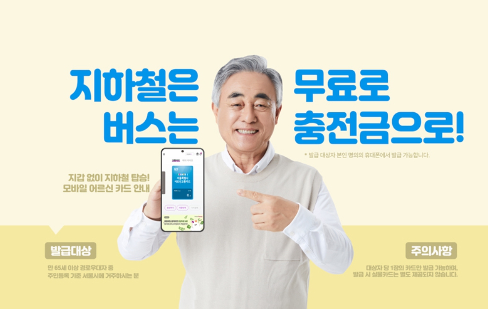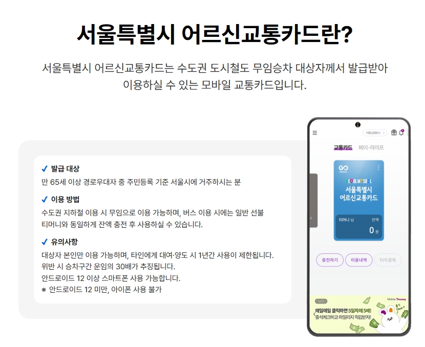 서울특별시에 거주하는 만 65세 이상 어르신들을 위한 복지 교통카드입니다. NFC 기능이 있는 스마트폰만 있다면 앱을 통해 간편하게 발급받을 수 있으며, 수도권 지하철은 무임 승차, 버스는 선불 충전</strong 후 일반 교통카드처럼 사용할 수 있습니다.