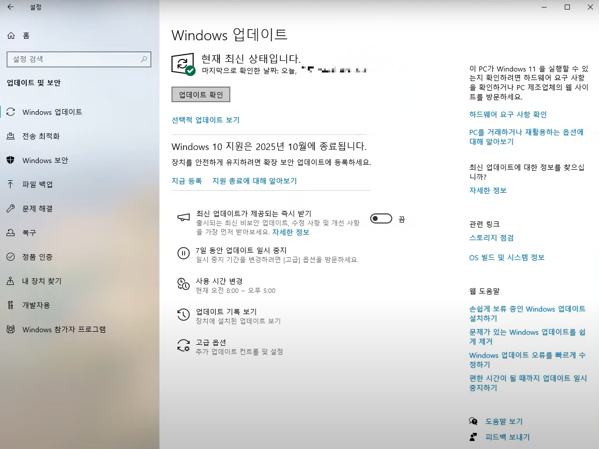 1. 설정 > 업데이트 및 보안 > Windows 업데이트