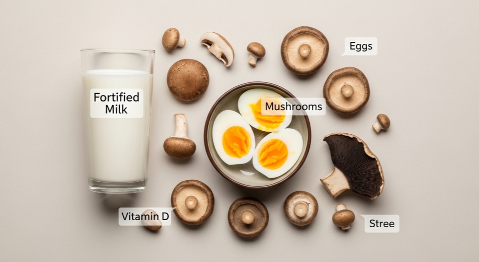 - 풍부한 식품: 달걀, 버섯, 강화 우유