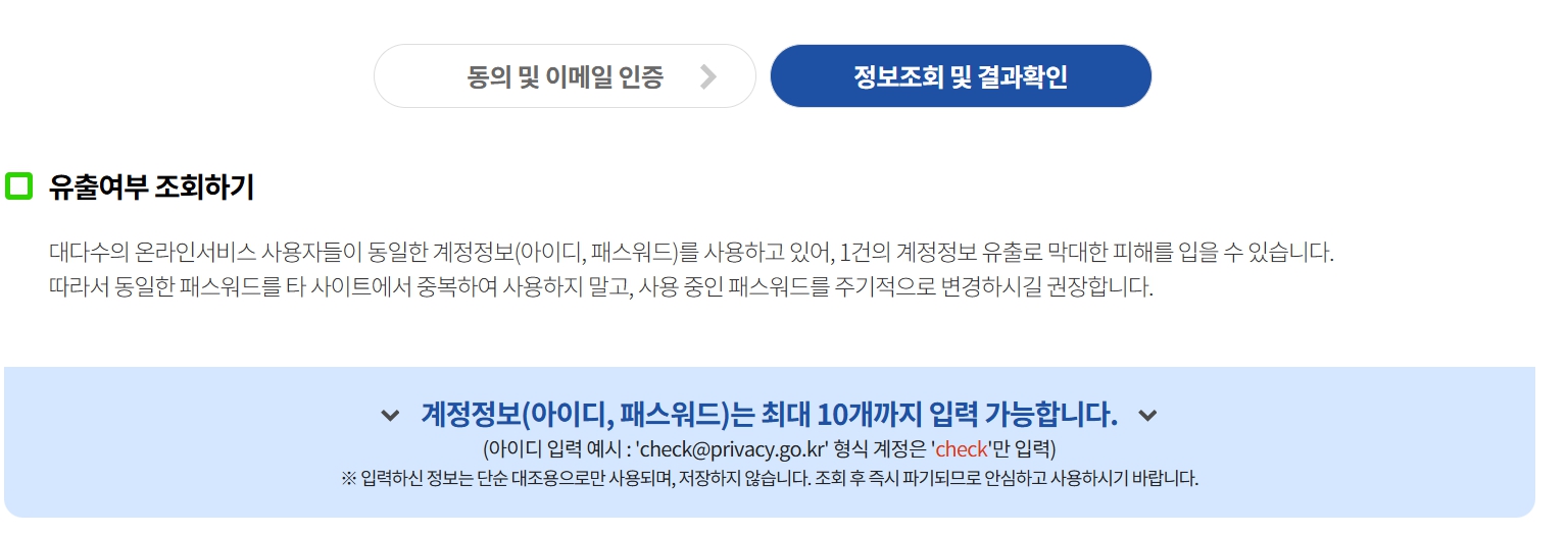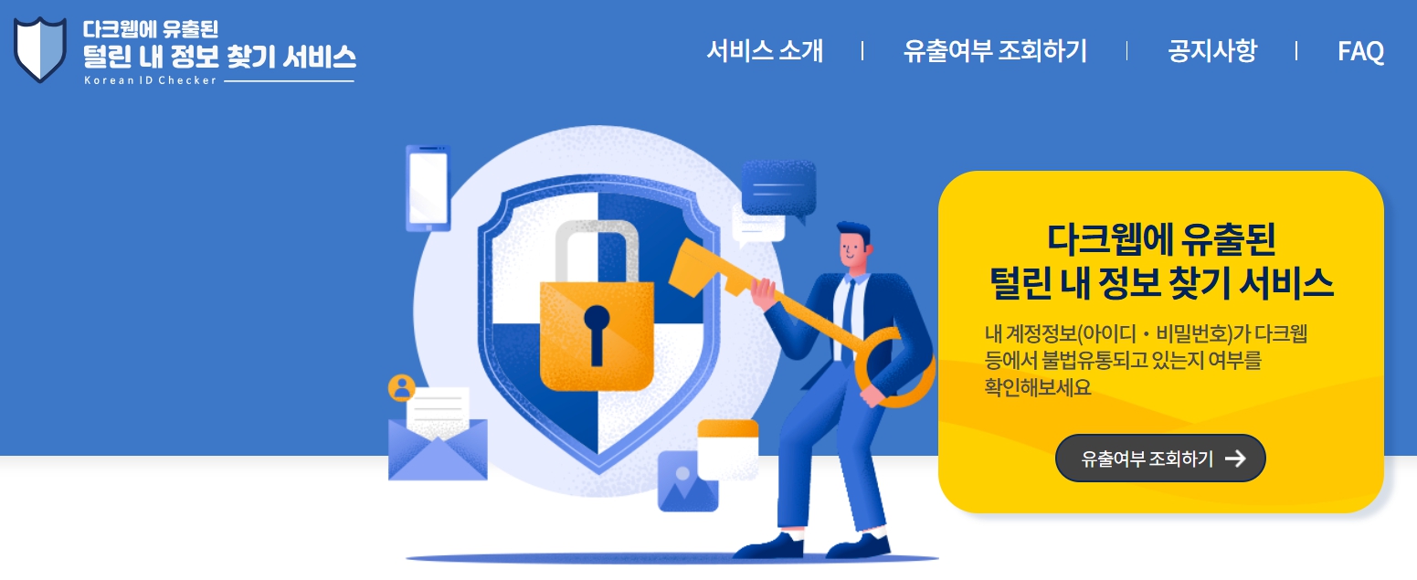 정부 인증 사이트로, 내가 사용 중인 아이디/비밀번호가 유출되었는지 조회할 수 있어요.