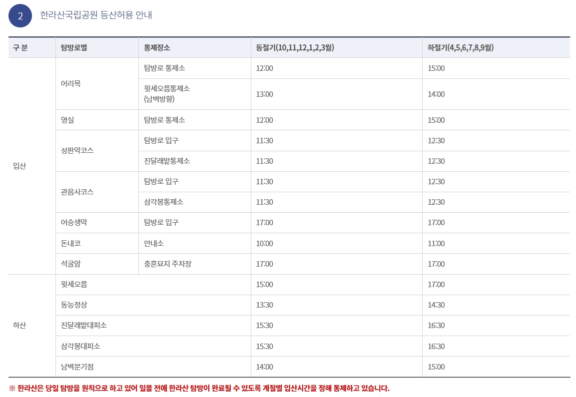 | 시즌 | 성판악 입산 가능 시간 | 정상 도착 제한 | 하산 제한 |
