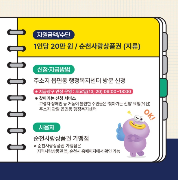 1인당 20만원을 순천사랑상품권(지류)으로 지급합니다.