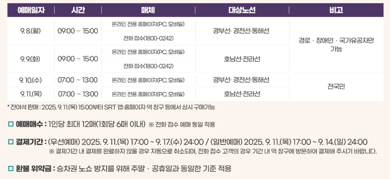 KTX와 SRT 예매 일정은 각각 다르며, 결제기한도 반드시 확인하셔야 합니다.