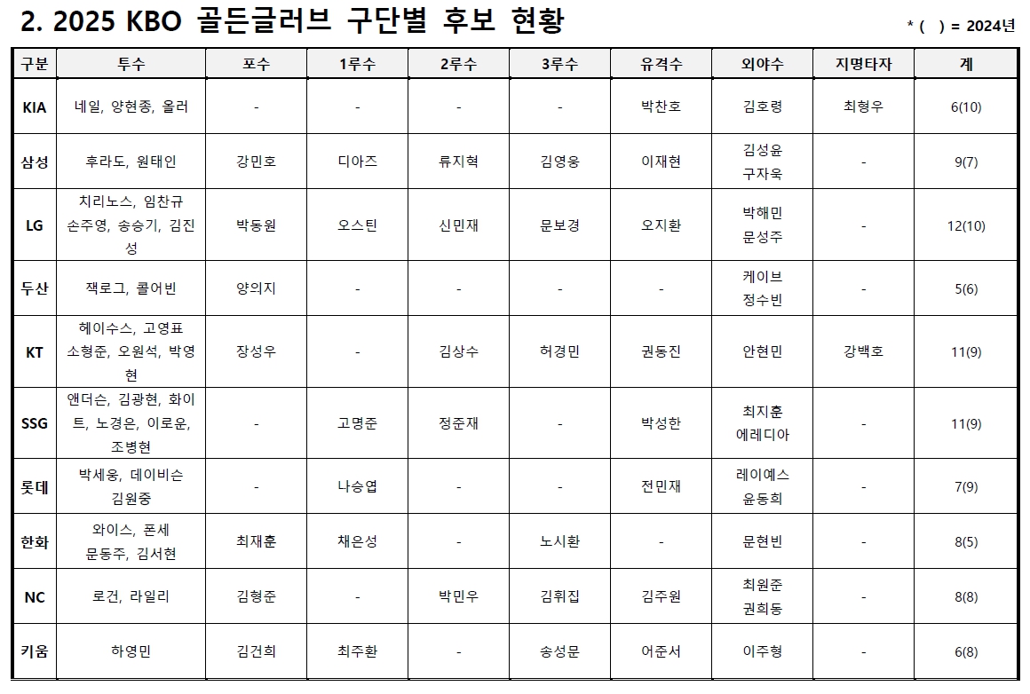 📊 2025 KBO 골든글러브 후보 현황