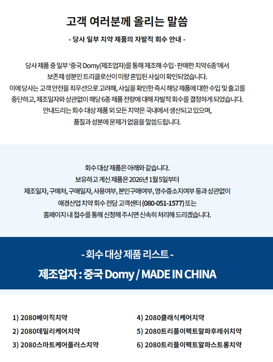 이번 회수 대상은 모두 2080 브랜드 치약이며, 중국에서 제조된 제품입니다.